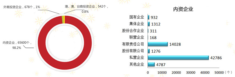 在工业企业法人单位中,内资企业65600个,占98.2%;港、澳、台商投资企业542个,占0.8%;外商投资企业678个,占1.0%。内资企业中,国有企业932个,占全部企业的1.4%;集体企业1312个,占2.0%;私营企业42786个,占64.0%。