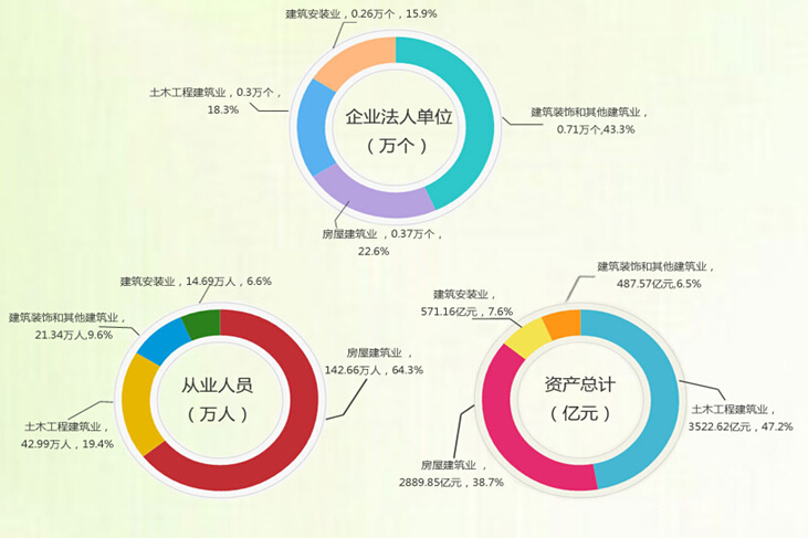 建筑业企业法人单位中,房屋建筑业占22.3%,土木工程建筑业占18.3%,建筑安装业占16.0%,建筑装饰和其他建筑业占43.3%。
